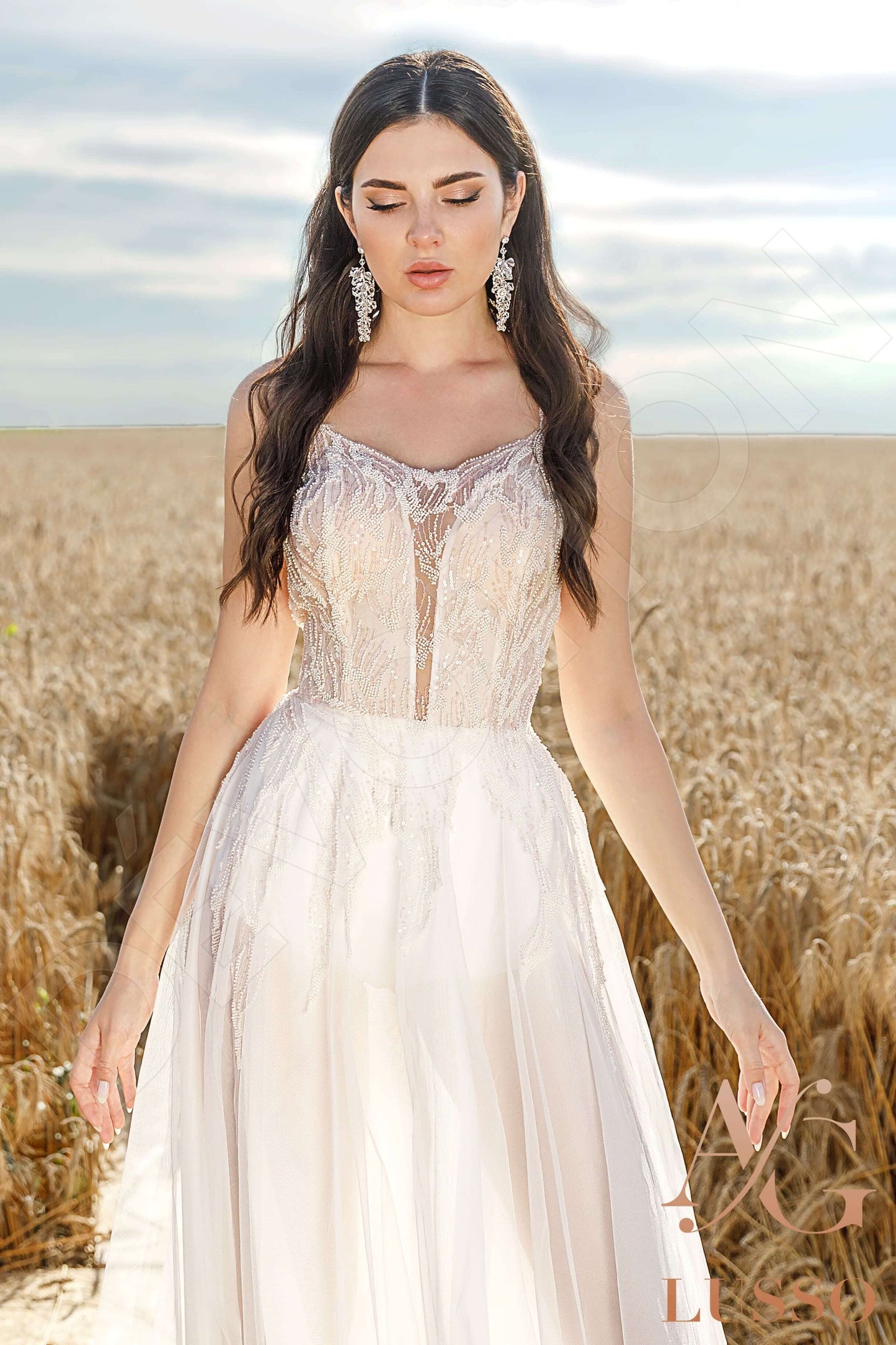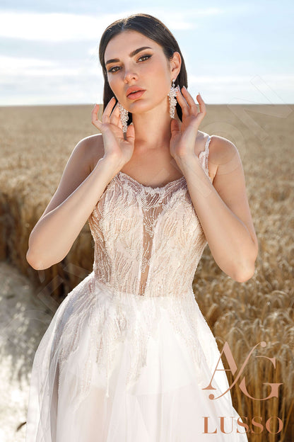 Angelina & Giovanni Lusso presents the Ariellia wedding dress, an elegant A-line silhouette featuring a scoop neckline and straps for a timeless aesthetic. The natural waistline is detailed with intricate beading that shimmers in the light. Crafted from luxurious guipure fabric, mesh and stretch fabrics respectively, the Ariellia allows you to move freely on your special day while remaining comfortable. Plus, its detachable skirt allows you to switch up your look anytime while its floor-length sweep train adds drama. It also features an open back and built-in bra for support and comfort on this elegant gown perfect for brides wanting to look and feel beautiful on her special day.