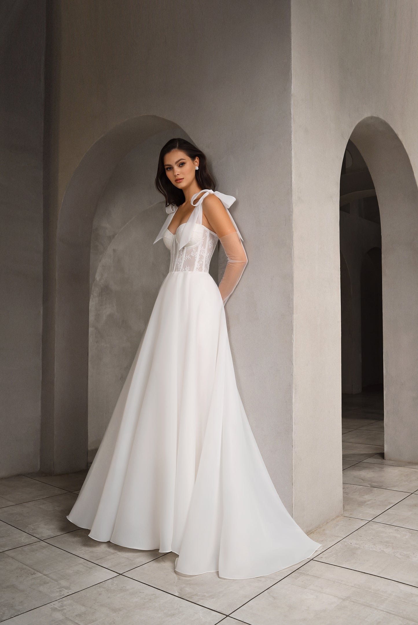 This A-line wedding dress is made out of organza, Chantilly lace and satin.