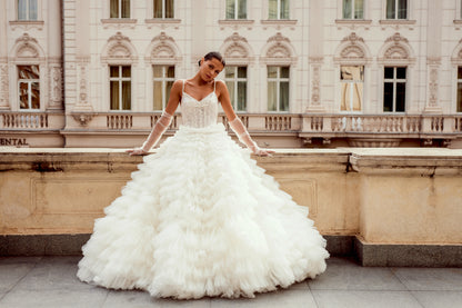 This stunning Princess/Ball gown wedding dress is crafted from guipure, various types of mesh, and satin, and is adorned with sequins and beads