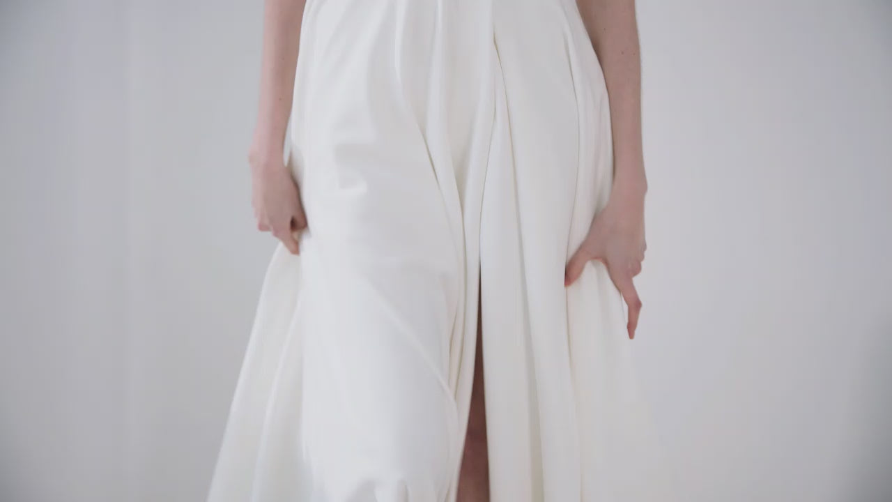 This A-cut wedding dress with slit is made out of crepe fabric or stretch satin.