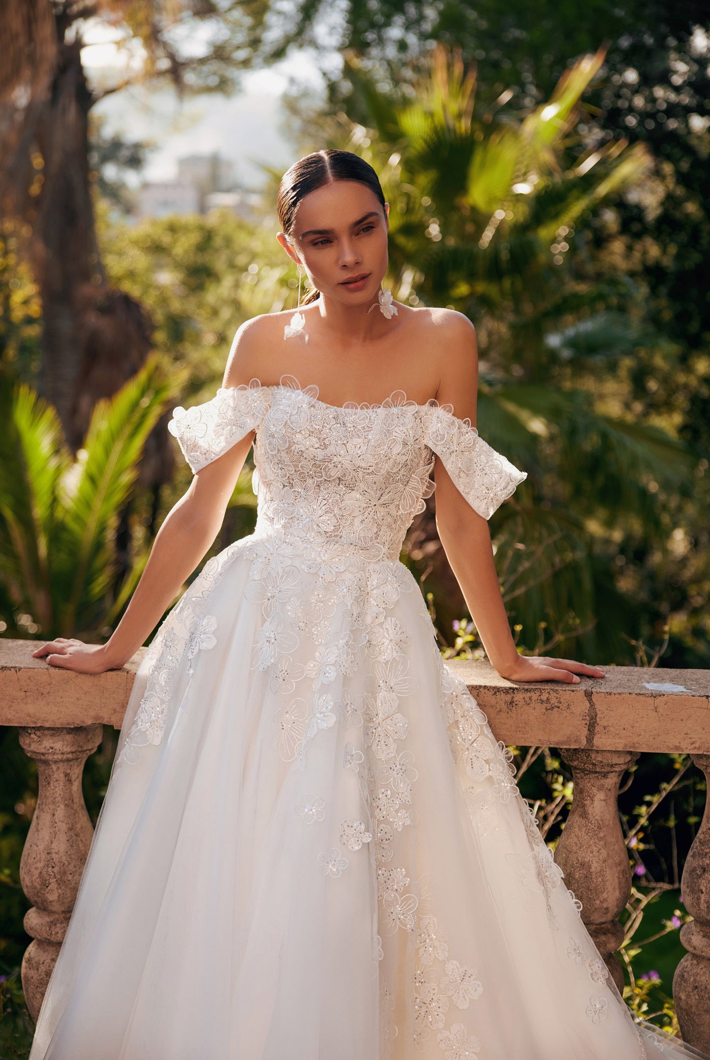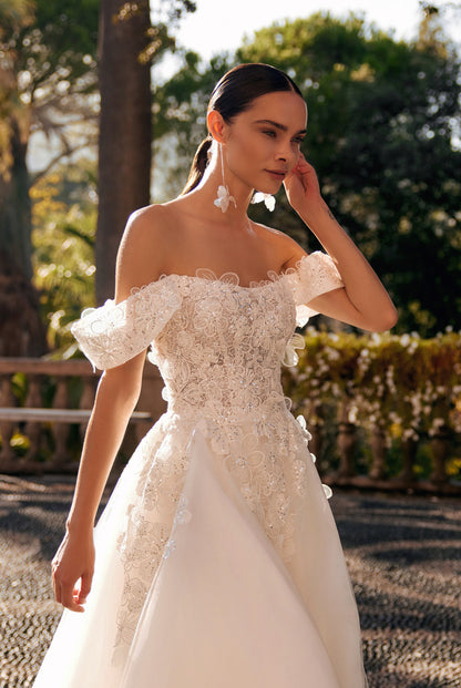 This A-line wedding dress is made out of guipure, mesh, tulle and decorated with floral décor, lace appliques, sequins.
