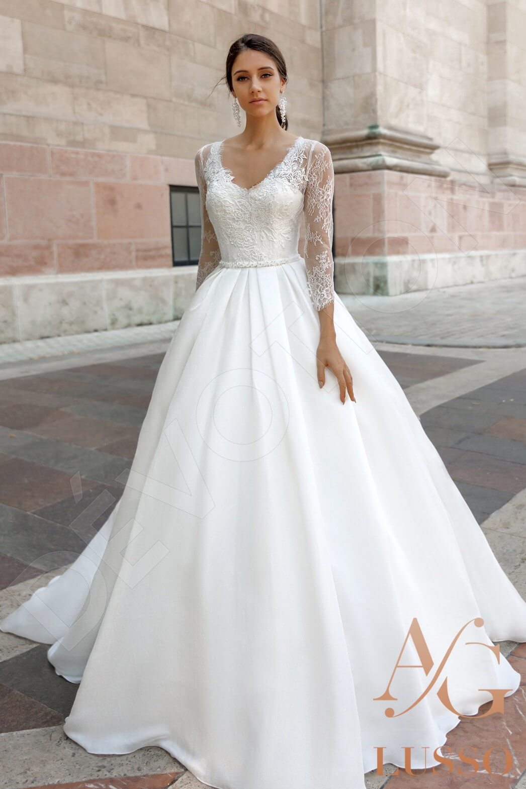Angelina & Giovanni Lusso presents Alohi, an elegant A-line wedding dress featuring Chantilly lace and Guipure accents for a timeless bridal ensemble. This flattering bodice features a V-neckline and 3/4 length sleeves, as well as an elegant corset at the waist to create an hourglass silhouette. The floor-length skirt is made of Organza fabric and falls into an elegant court train. For added glamour, intricate Bead and Lace Chantilly embellishments adorn this dress. The back features a full back with buttons for secure fit, while the Alohi dress comes in Ivory color with built-in bra for extra support. Channel your inner elegance with this stunning gown from Angelina & Giovanni Lusso.