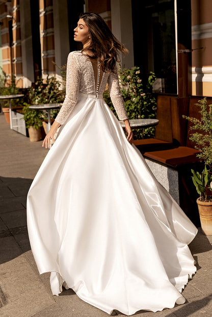 This A-line wedding dress is made out of satin, mesh and guipure with beads fabrics and is decorated with sequins and imitation pearls.